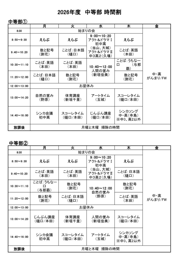 ※曜日により科目が変わることがあります。
